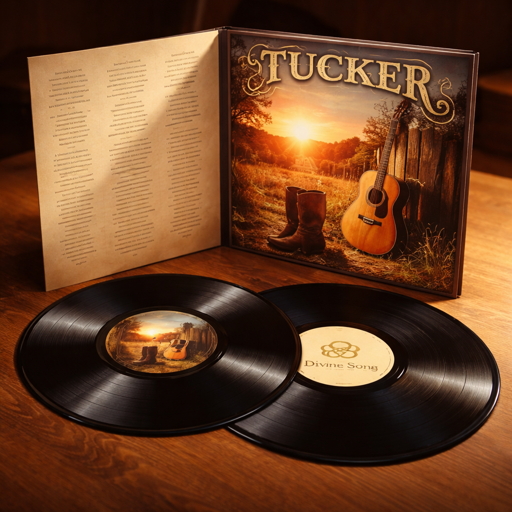 A real vinyl record with custom jacket artwork, printed lyrics, and your song on both sides — a collectible keepsake.