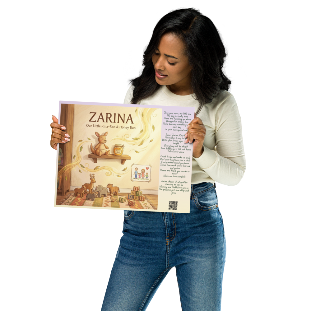 A vibrant glossy metal print featuring your album art, lyrics, and a QR code — scratch and fade resistant, ready to hang.