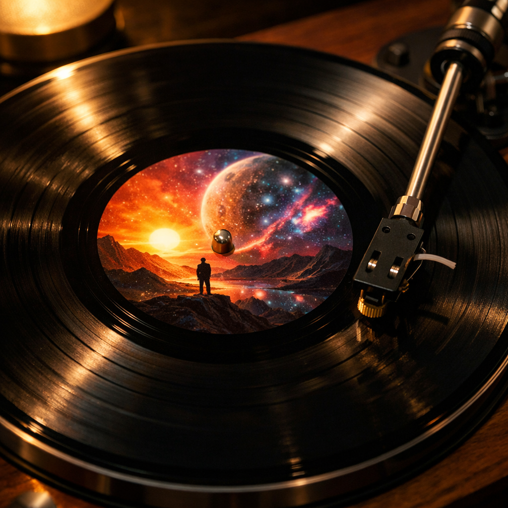 Imagine this on a real vinyl record β your artwork on the label, your song in the grooves.