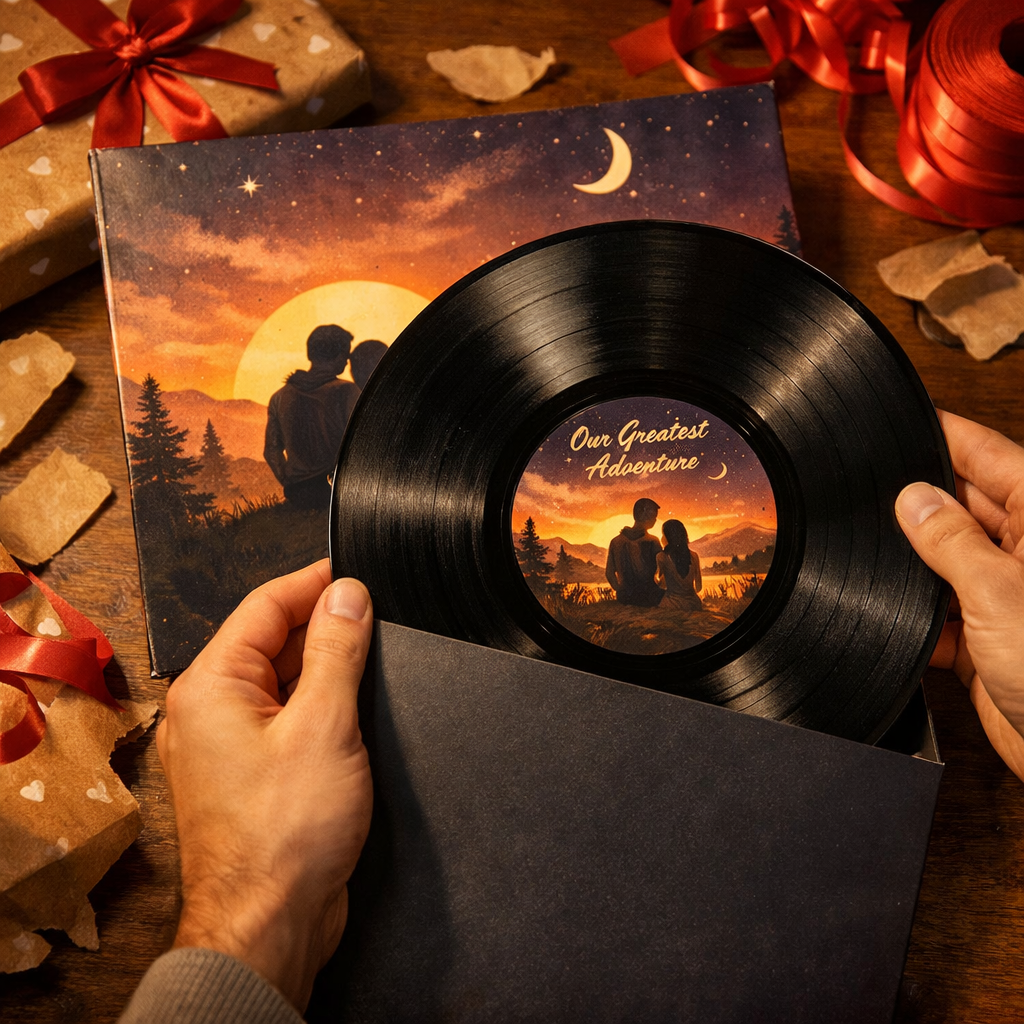 Your song was created just for you. Now hold it in your hands β a real vinyl record with your custom jacket artwork, your lyrics printed on the back, and your song pressed into the grooves. This isn't a novelty. This is a treasure.